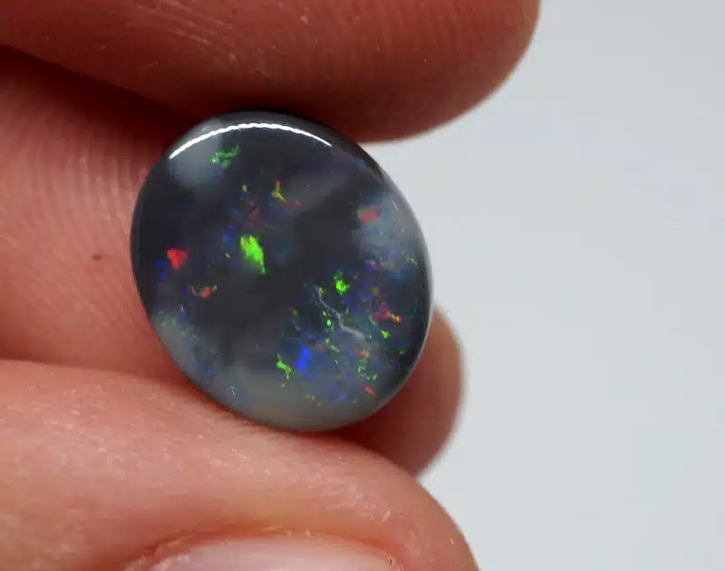 Belle opale noire naturelle polie de 2,99 carats, taillée en cabochon ovale, présentant un joli jeu de couleurs multicolore avec des éclats verts, bleus, rouges et orangés. Pierre idéale pour collection ou création de bijou.